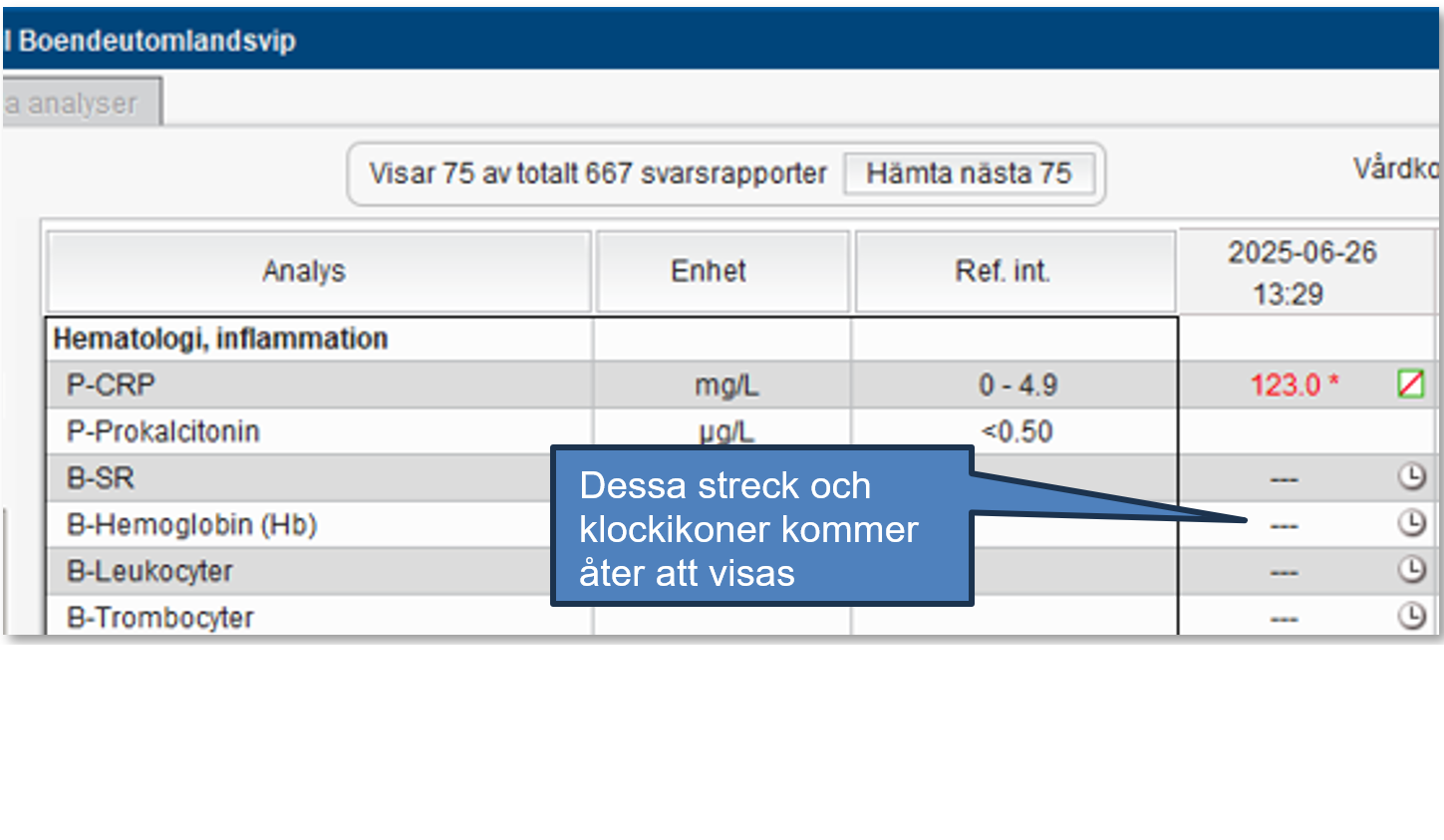 Vid rapportering av ett analysresultat i Cosmic har det sedan juni 2025 inte gått att se obesvarade beställningar från samma provtillfälle aviserade med en klockikon i ”Svar provbunden”, ”Inkorg svar” samt ”Inkorg osignerat och ovidimerat”. De tekniska orsakerna till problemet är nu lösta och fr.o.m. onsdag 25 februari kommer klockikonerna visas igen.