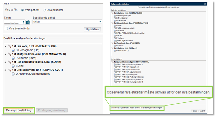 Beställningar till Klinisk kemi och Klinisk mikrobiologi har ett unikt identitetsnummer (RID) som finns på provetiketten. Om du delar en beställning, exempelvis för att patienten ska lämna blod- och urinprov men inte kan lämna urin vid provtagningen, får delar av beställningen ett nytt RID. Därför ska nya etiketter på den nya beställningen alltid skrivas ut när en beställning delas. Används de gamla etiketterna kommer det inte finnas någon beställning hos laboratoriet.