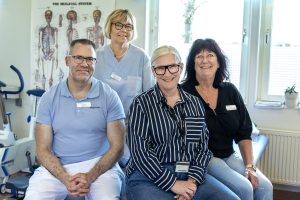 De flesta recepten förskrivs av vårdcentralens tre fysioterapeuter – Pia Nilsson, Ingemar Dahlgren och Christina Pihlgren. Vi bad dem, och chefen Linda Östman, att berätta lite mer om hur de jobbar.